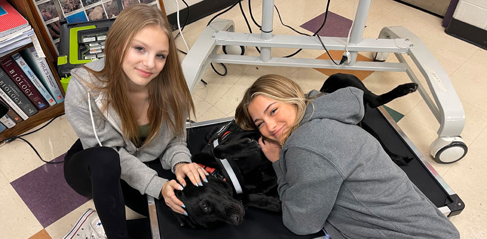 Not only does Rosie help alleviate stress with people in her proximity, she also helps create a positive school environment. Everybody at Pinckney Community High School knows Rosie. When I am walking Rosie to her next class, I feel like I am the entourage for a celebrity. Kids stop and ask, “Can I pet Rosie?” Those who don’t stop walk by and smile or say “Hi” to Rosie. Even the students who rarely don a smiling face in the hallway light up at the sight of Rosie.