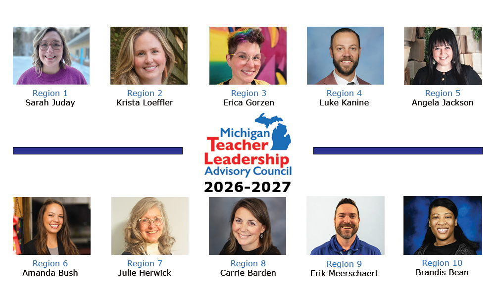 Together, the Regional Teachers of the Year make up the Michigan Teacher Leadership Advisory Council. The council’s mission is to bring teacher voices to a wider audience, including through direct work with MDE to provide input on proposed policies and initiatives and to help share valuable information and resources with their colleagues in their respective regions.